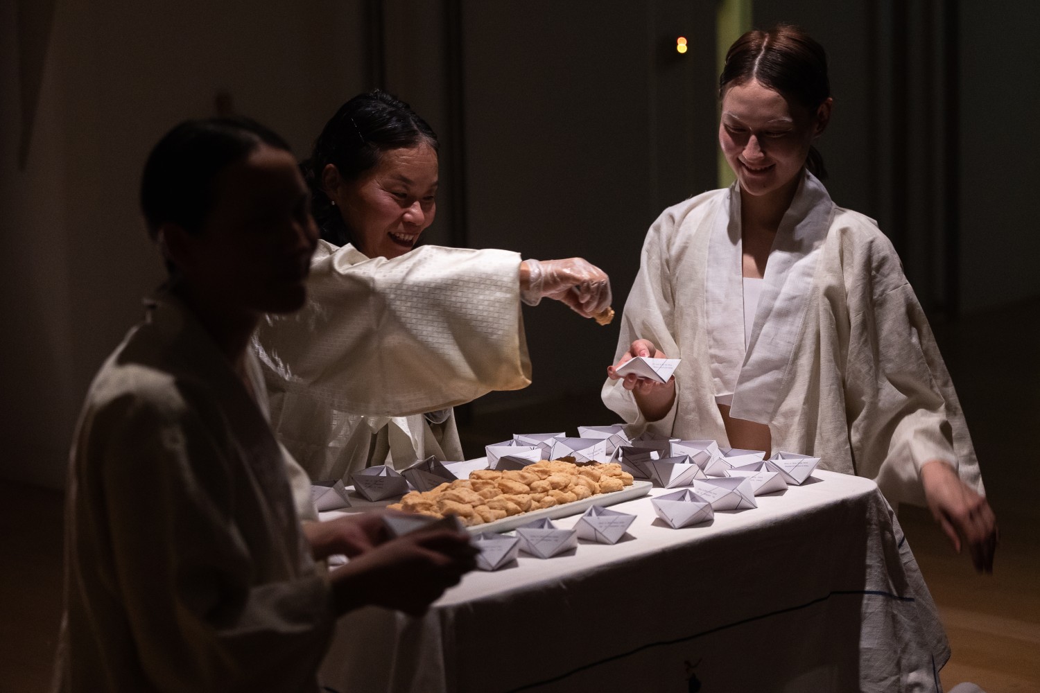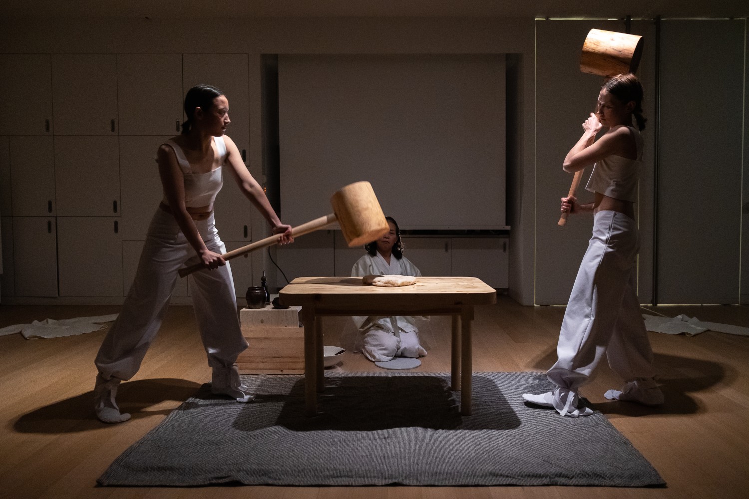 In Battered Comfort, my sister and I batter rice with hammers until it turns into tteok 떡 (rice cake) which we eat together with the audience. Eating tteok is a communal act which generates belonging, whereas battering it is violent and creates pressure. By pounding on the individual, society is formed – like rice grains pounded into tteok. Nevertheless, tteok is all about sharing: through violence a sense of belonging and comfort is created. Belonging and pressure exist in the same space and need each other.