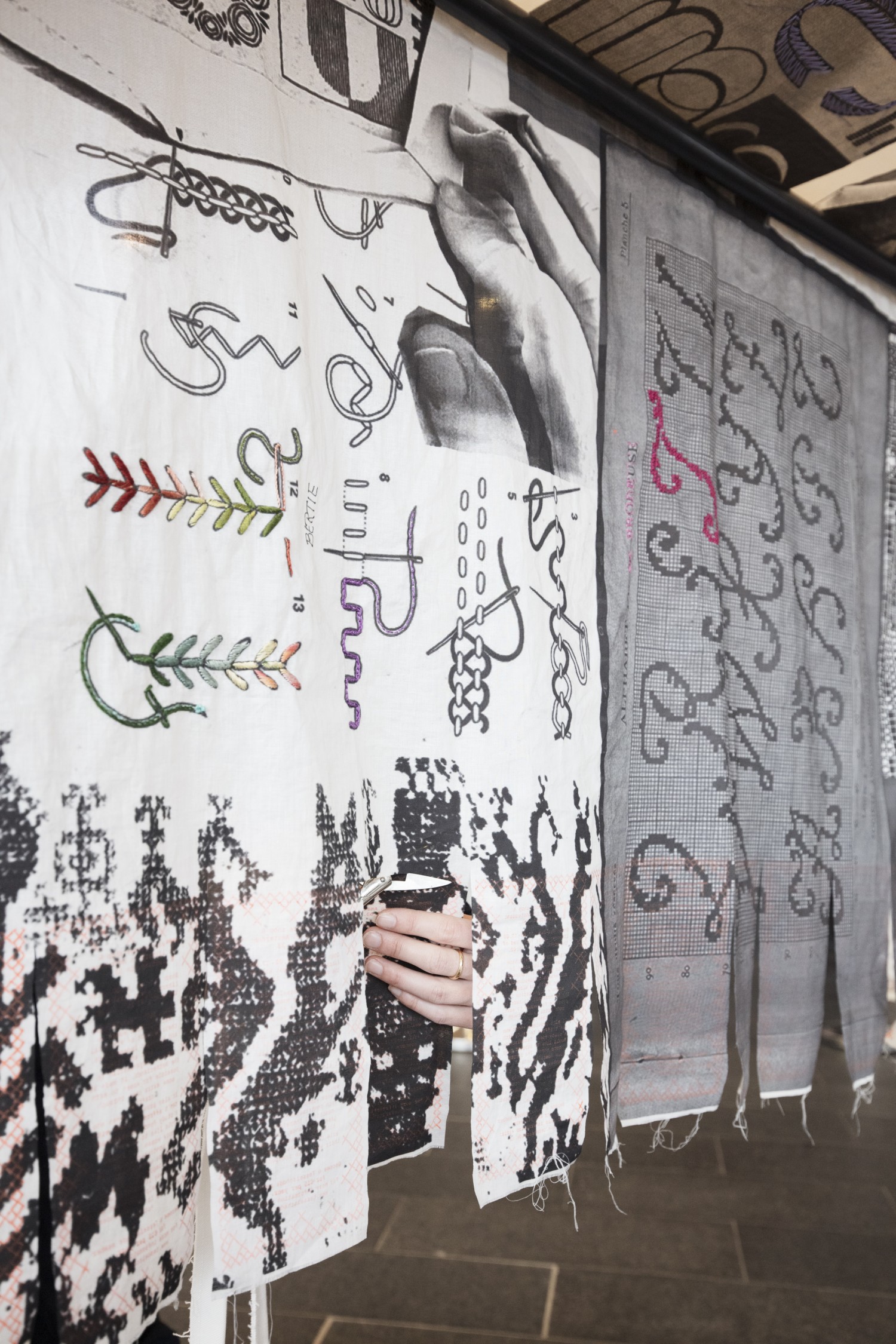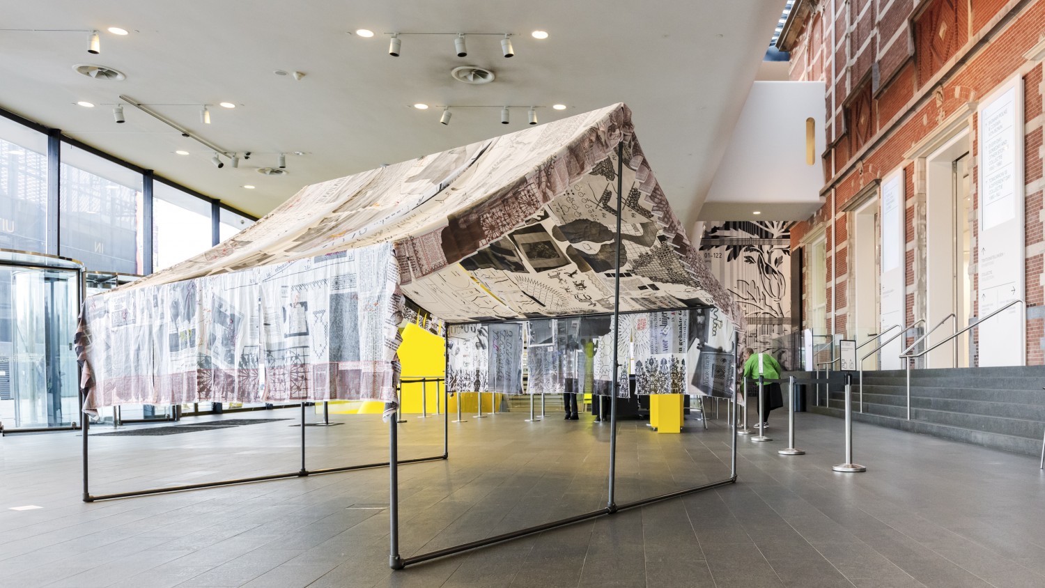 With this collaborative textile piece, participants in the Elck Syn Waerom workshop show some of the rich history that can be found in the library of Tesselschade Amsterdam. The piece exhibits various images found in the library, as well as several embroideries and works in other techniques that were discovered there, which were added both by participants in the workshop and Tesselschade’s members. The textile piece takes the shape of a tent, a portal, where we ask the visitor to ponder for a moment the (often rendered invisible) history of women’s labour and the inferior position that handcrafts (still) occupy within the arts. The tent offers respect to the many women – past, present and future – who have dedicated time and energy to Tesselschade, making it into a refuge for women in need of financial support.