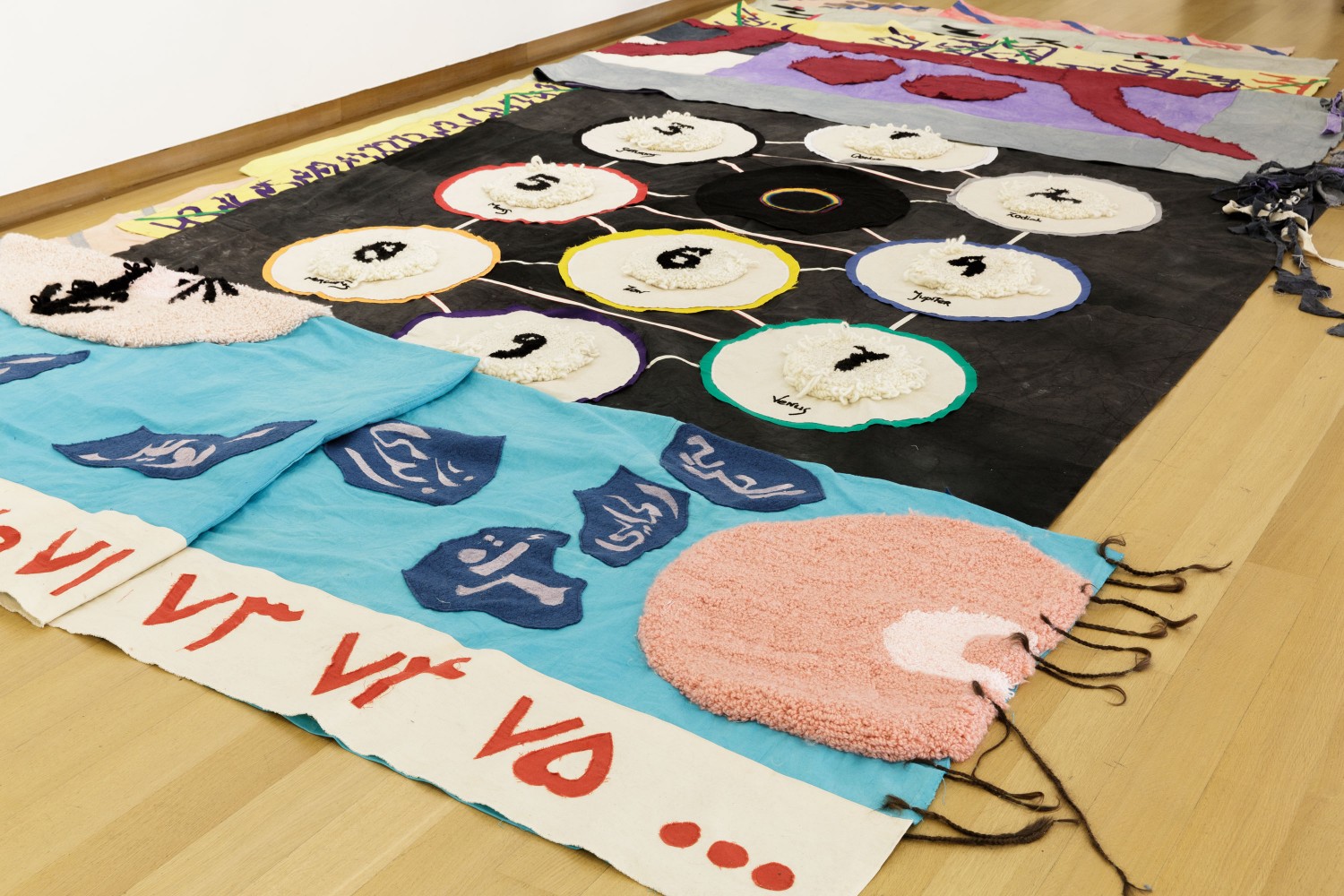 Floor pieces (cotton, wool and mixed media) and memorial kite (mixed media on paper)