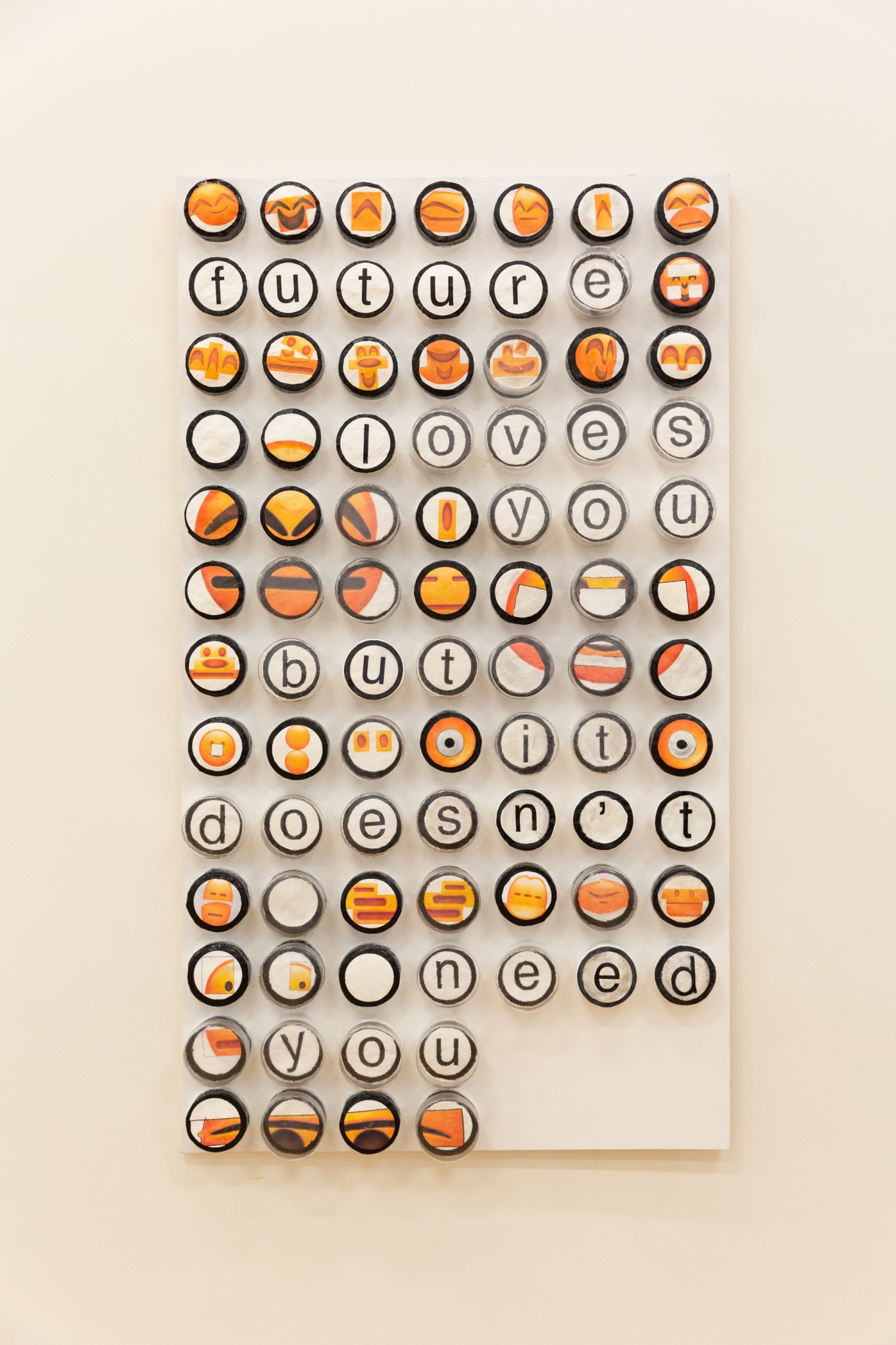 FUTURE LOVES YOU BUT IT DOESN'T NEED YOU is a work in which distorted faces are assembled with the elements of a highly recognisable emoji keyboard. It aims to challenge the oversimplified labelling of emotions that is ubiquitous in digital communications. The work seeks to resist what the omnipresence of technology does to our experience of the world: it reduces the ungraspable complexity of reality and the self to an oversimplified interactive semiotics. I am interested in how our sense of self is distorted as humans and technology merge into a glitched hybrid being.